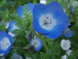 写真はネモフィラ・インシグニス。株いっぱいにつける澄んだ空色の花が魅力で、英名はベイビーブルーアイズ(赤ちゃんの青い瞳)です。北アメリカ西部原産です。