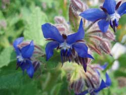 青い星型の花を多数咲かせる地中海沿岸原産のハーブです。全草が食用になり、若葉をてんぷらや炒め物にするほか、花や葉をハーブティーなどの利用します。花を白ワインに浮かべると、花色がピンクに変わります。強壮作用があり、気管支炎に効果があるといわれます。